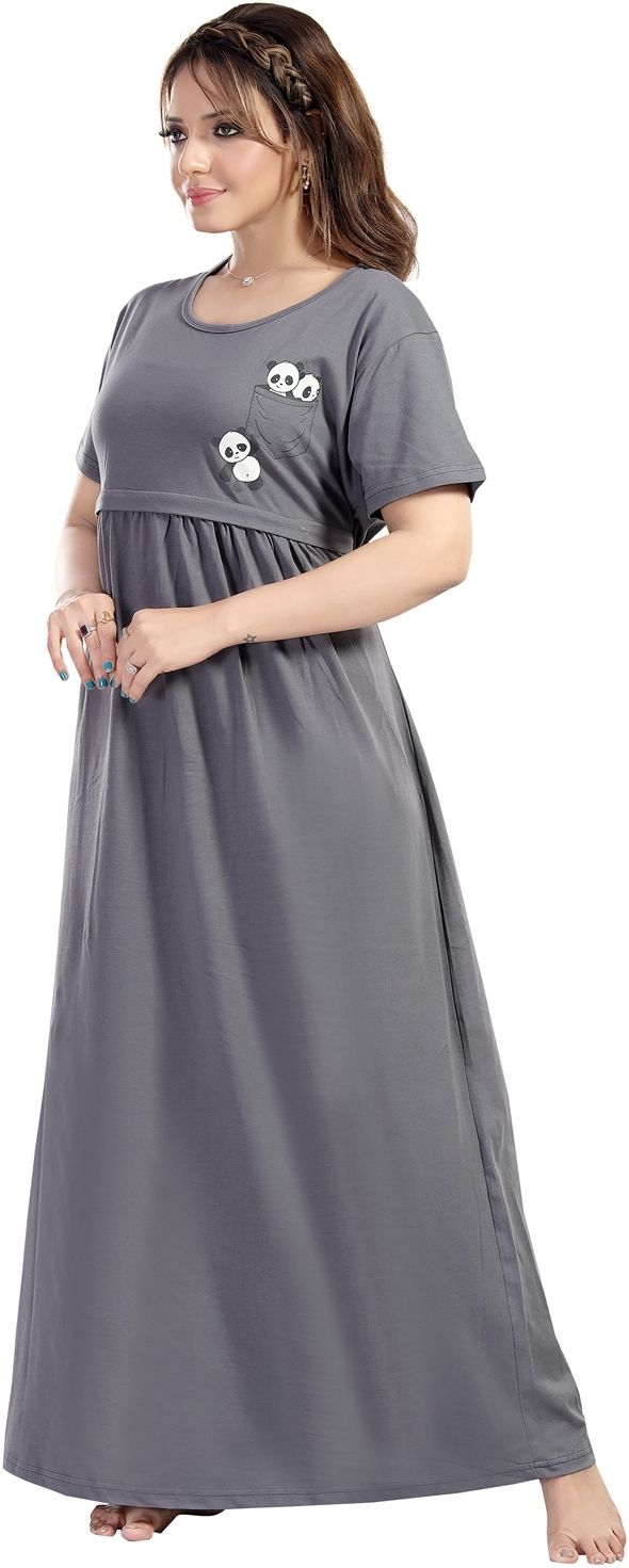Fabme Women's Full Length Printed Pre and Post Pregnancy Pure Cotton Nursing Nightdress Nighty - Grey