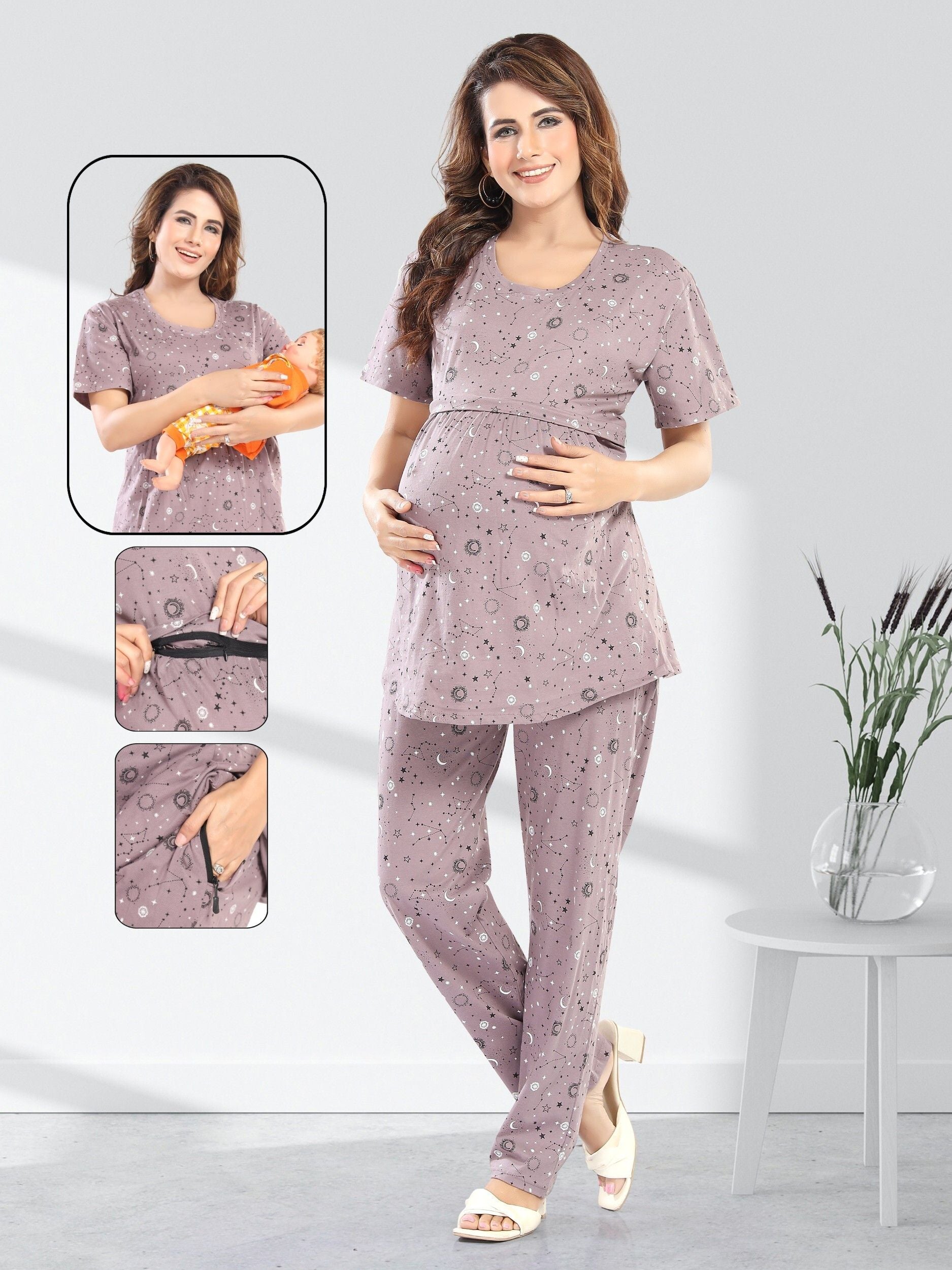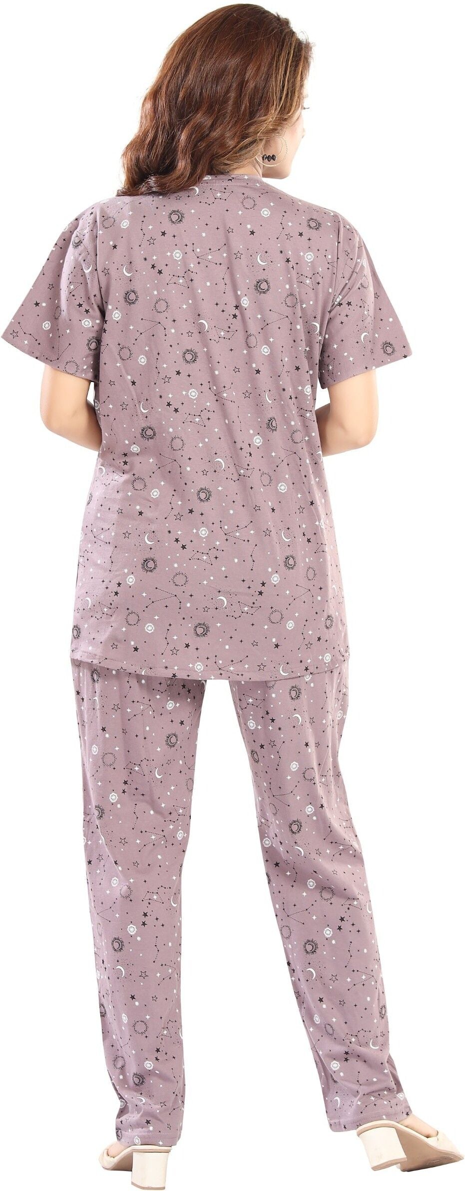 Fabme Pure Cotton Knit Half Sleeves Printed Night Suit - Purple Grey