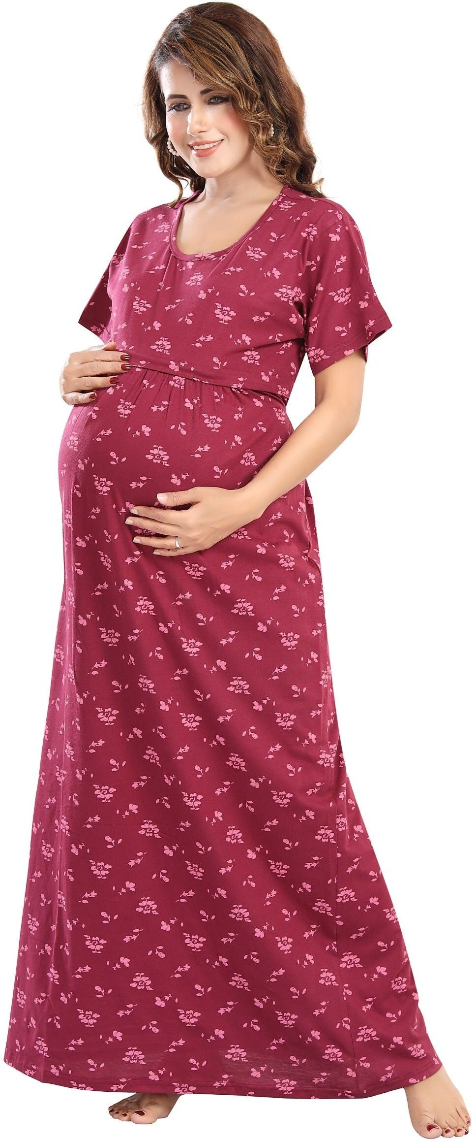 Fabme Women's Full Length Printed Pre and Post Pregnancy Pure Cotton Nursing Nightdress Nighty - Dark Pink